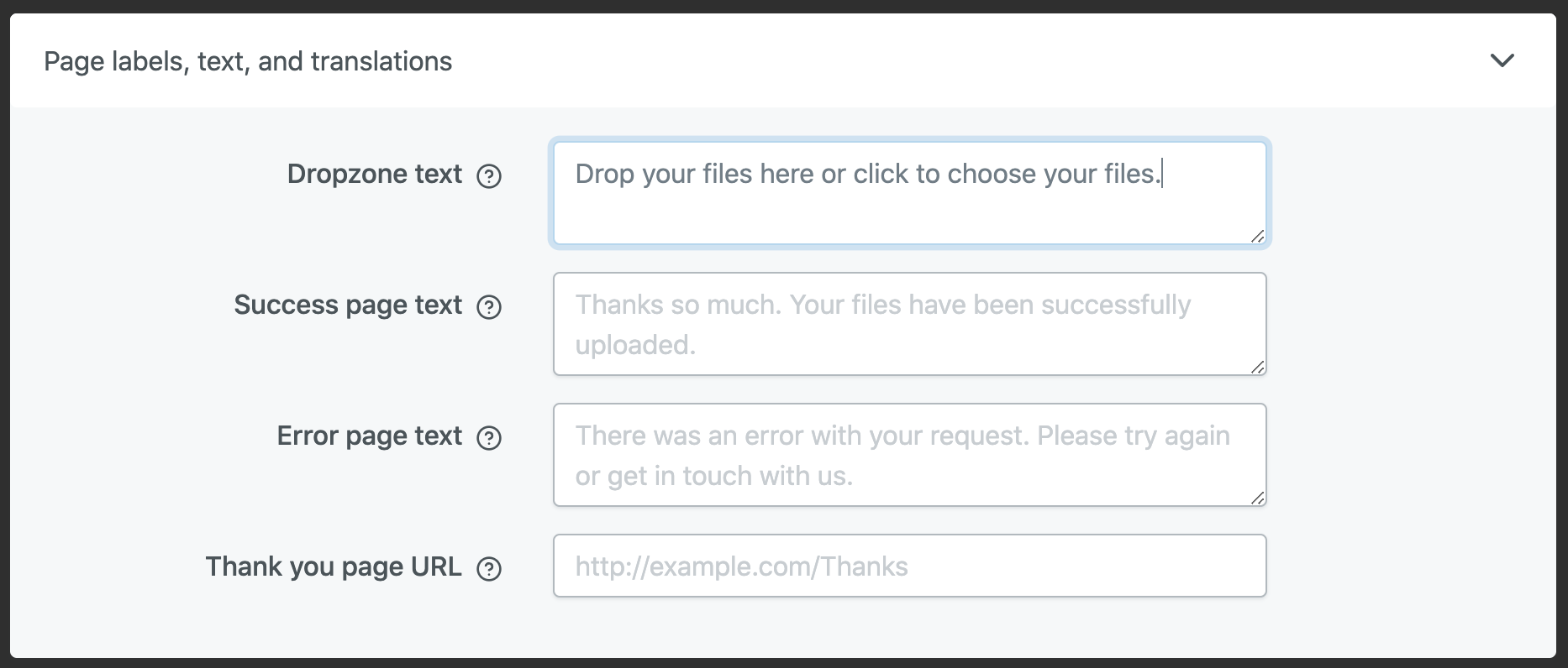 You can change the page labels and text for the dropzone text, success page text and error page text. This means you can maintain your in-house tone of voice.