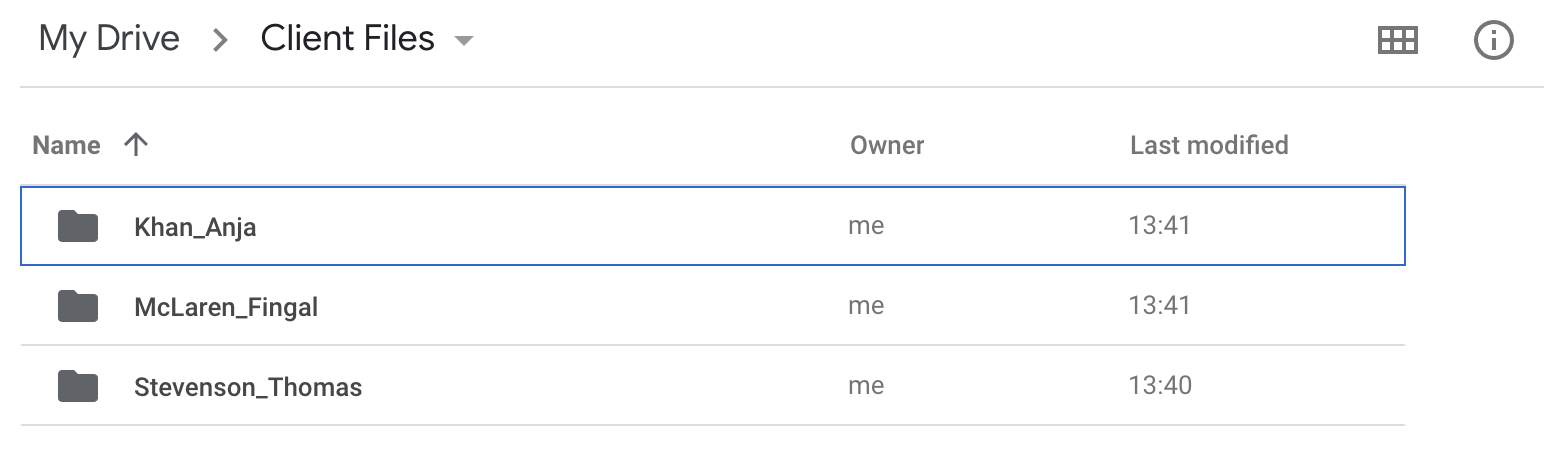 You’ll then have all your client’s files organized in the correct subfolders on your cloud file system. In this example, client data is organized by name.
